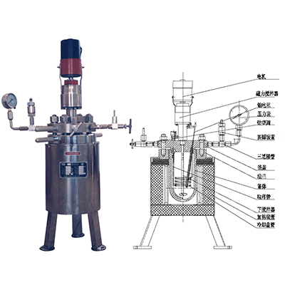 GSA型反應釜采用端面稀土耦合驅動器,具有靜密封、無泄漏的特點。釜體材料主要采用1Cr18Ni9Ti 不銹鋼,并可根據不同介質要求制作316L不銹鋼、鈦材(TA2)、鎳材、鉭材、鋯材、哈氏合金、內襯聚四氟乙烯等特殊材質。攪拌軸承采用耐腐蝕不銹鋼軸承,適合高轉速、加氫催化,低粘度物料的攪拌,攪拌槳采用推進式攪拌漿。加熱方式一般為干式電加熱,也可根據用戶要求制作電加熱導熱油加熱或夾套加熱。帶有多功能控溫、控壓數顯控制箱。加熱控制系統采用PID自動溫度控制儀表,溫度控制十分準確。 儀表經整定后,可有效減輕溫度過沖。出料方式有上出料和下出料兩種,供用戶訂貨時選用。該系列產品具有運轉平穩、噪音小、操作方便等特點,是用戶進行各種化學反應試驗的理想裝置。
